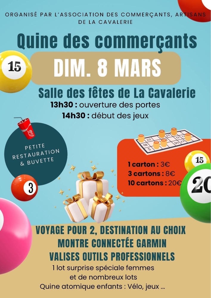 Salle des fêtes de La Cavalerie – Ouverture des portes : 13h30 – Début des jeux : 14h30 Organisé par l’Association des commerçants, artisans de La Cavalerie. 1 carton : 3 € – 3 cartons : 8 € – 10 cartons : 20 € Voyage pour 2, destination au choix, montre connectée Garmin, valises outils […]