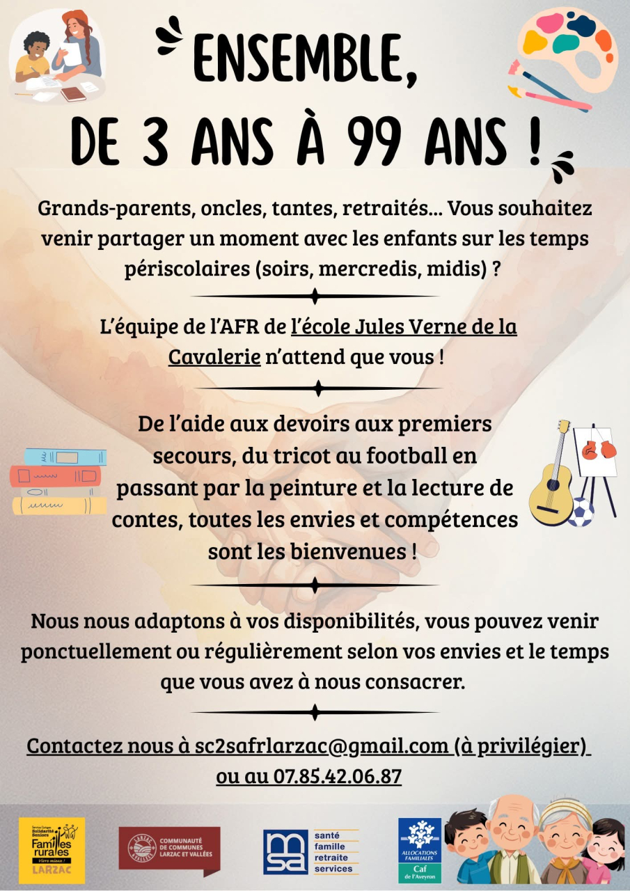 ENSEMBLE DE 3 ANS à 99 ANS. L’équipe de l’AFR de l’école Jules Verne de La Cavalerie vous attend !