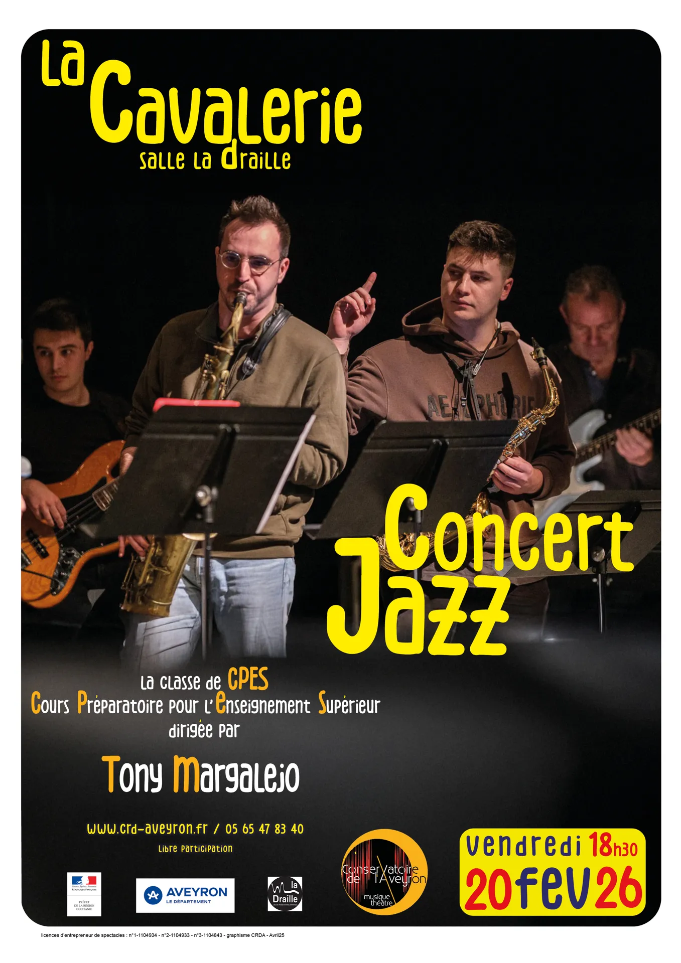 Les élèves de la classe CPES jazz (cours préparatoire pour l’enseignement supérieur) se produisent en concert à l’issue d’un stage de 2 jours dirigé par Tony Margalejo, artiste-enseignant au Conservatoire de l’Aveyron.