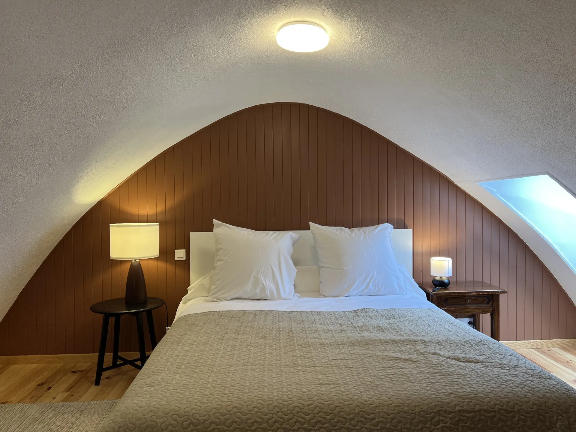 Côté nuit, une chambre est aménagée en rez-de-chaussée (lit 160) et à l’étage, une mezzanine (1 lit 140) et une chambre voûtée (1 lit 160) sont aménagées.